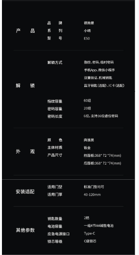 | 规格参数 | 德施曼智能门锁指纹锁密码锁联网锁小嘀E50 典雅黑 | |||||
