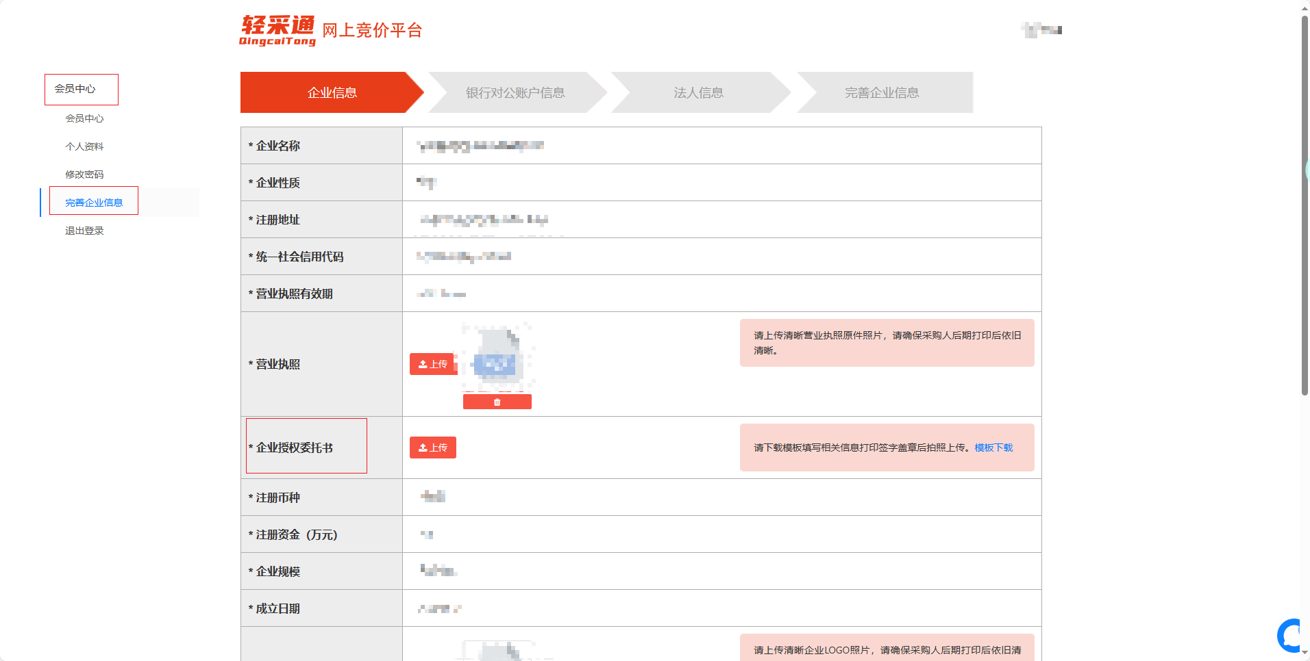 应学校规范要求,供应商请登录平台,到【会员中心】下【完善企业信息】页面中,上传“企业授权委托书”图片,提交后等待平台审核,审核通过后即可正常使用。
